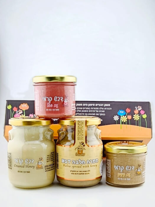 המארז מכיל: ממרח חלבה דבש 300 גרם, ממרח דבש קרמי לבן 300 גרם, ממרח דבש קרמי עם פטל 135 גרם וממרח דבש קרמי עם קינמון 135 גרם.