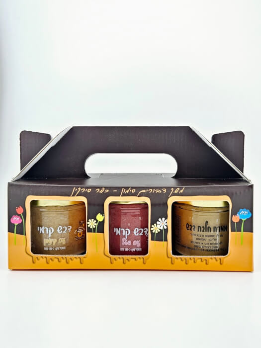 המארז מכיל: ממרח חלבה דבש, ממרח דבש קרמי פטל וממרח דבש קרמי קינמון.